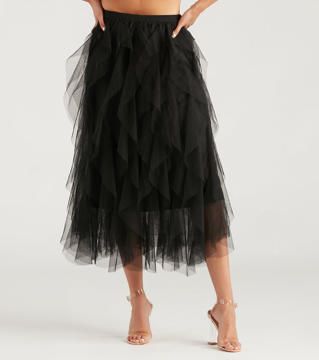 Bring a little drama to your look with this ruffled tulle midi skirt that will add a chic flair. It features a high-rise elastic banded waist for comfortable wear, a midi-length hem with a flowy, A-line silhouette, and a sheer ruffled tulle design over a knit lining. Style with a corset top and mules.
