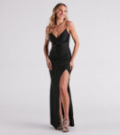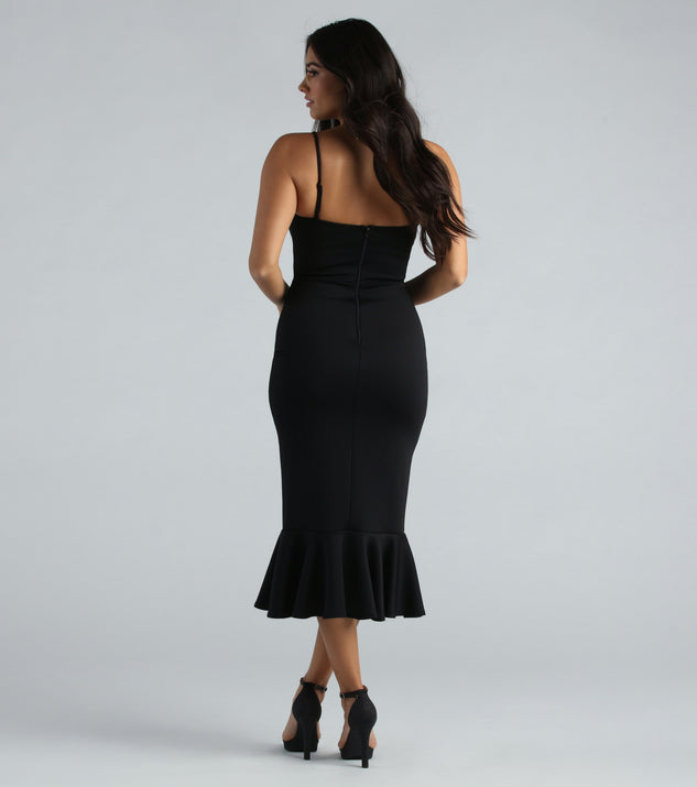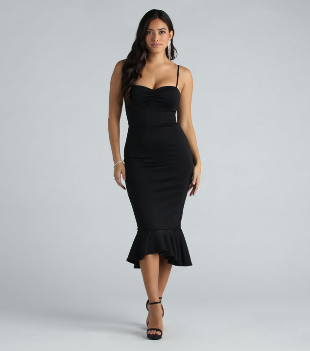 The Aleah formal trumpet hem midi dress is a chic choice for wedding rehearsals, banquets, or parties! She features a sleeveless sweetheart neckline with a built-in padded bust, adjustable spaghetti straps for a customized fit, a high waist seam, a midi-length trumpet hem with a ruffled design, and a form-hugging silhouette. The smooth crepe fabric offers a moderate stretch. Style with clear heels.