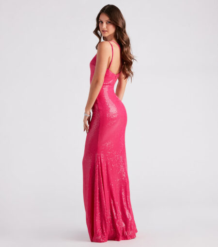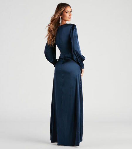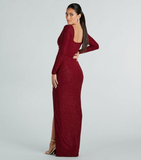 - Floor-length hem, form-fitting silhouette, high slit