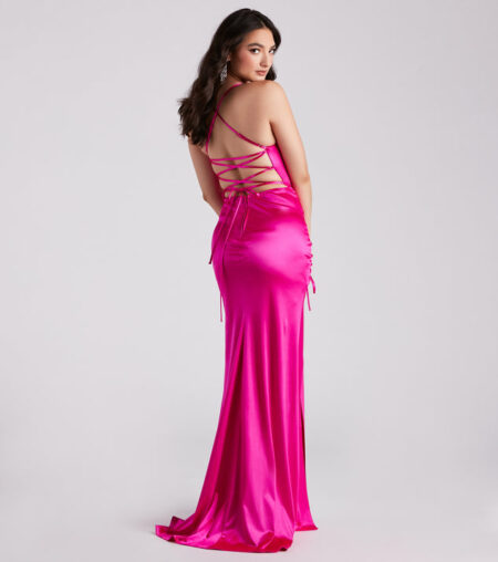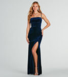 - Floor-length hem, form-fitting silhouette, high slit