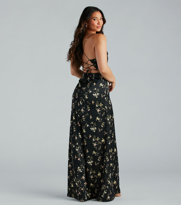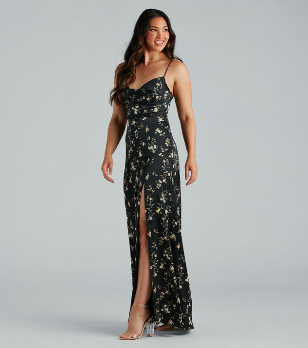 Long in reasons to love, the Mackenzie formal satin dress will have you feeling so romantic! She features a sleeveless cowl neckline, sleek spaghetti straps that lace up along the back, and a flattering A-line silhouette, high front slit, and floor-length hem. The formal dress is crafted from a silky satin fabric with a gorgeous dainty floral print and has a smooth woven lining. Complete the look with a sparkly clutch and strappy heels for an outdoor wedding or black tie soiree!