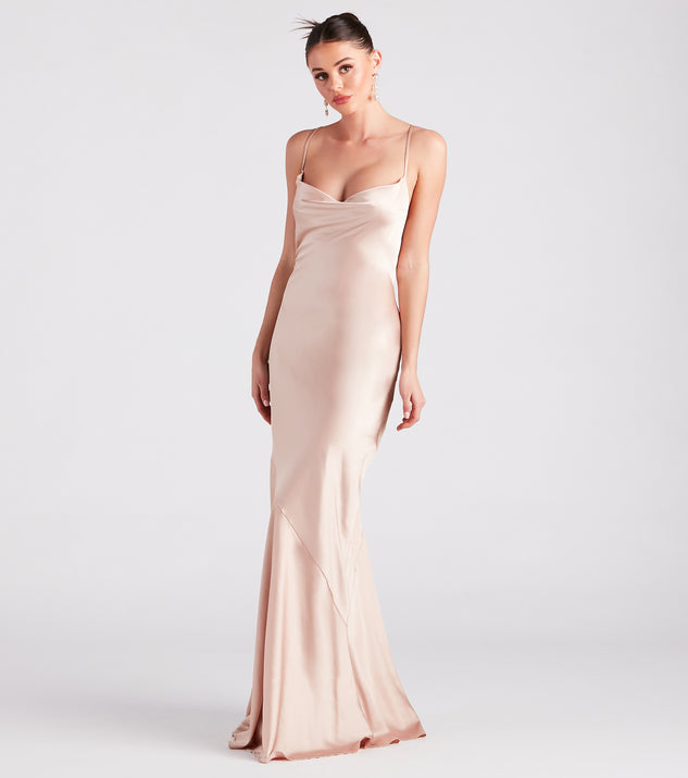 The Vanessa formal satin dress gives an aurora of dreamy romance with subtle hints of sophistication! Perfect for bridesmaids, black tie galas, and award banquets. She features a sleeveless cowl neckline, adjustable spaghetti straps that crisscross along the back, and a hip-hugging slim silhouette with a floor-length hem. The formal dress is composed of a silky satin fabric with a sheen effect. Complete the look with statement earrings.