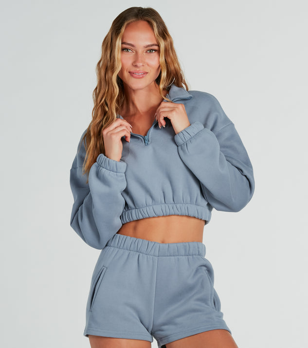 Get ready for chill vibes in this cozy crop sweatshirt! It features cozy long sleeves with elasticized cuffs, a mock neckline with a half zip closure, an elasticized cropped hem, and a warm fleece lining. Complete the look with the trendy matching shorts for lounging or running errands!